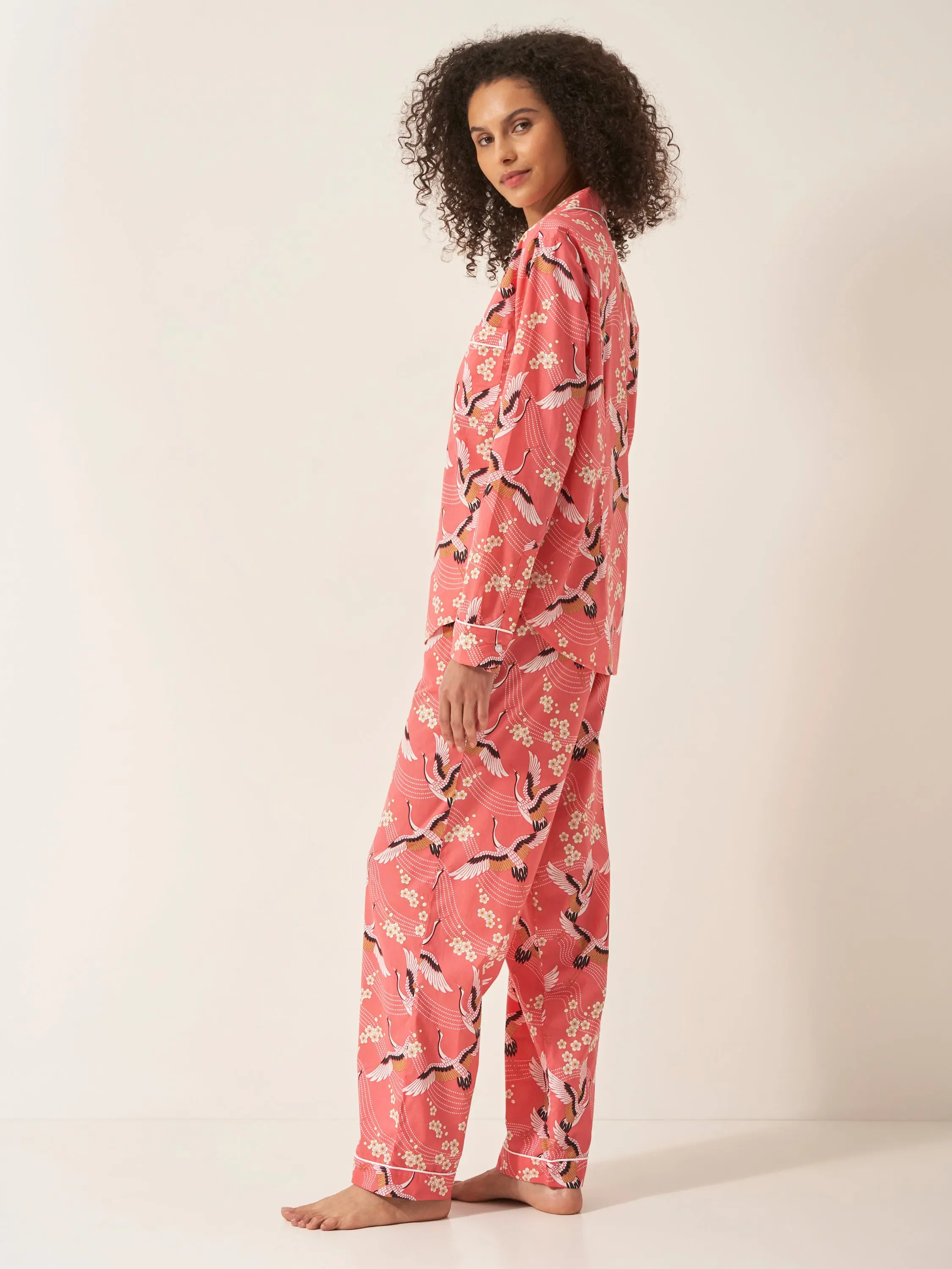 Japanese Crane on Coral Organic Cotton Pyjama Set – A Tranquil, Luxe Escape